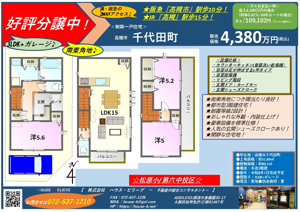 高槻市千代田町 新築一戸建 3LDK 4,380万円【好評分譲中】♪