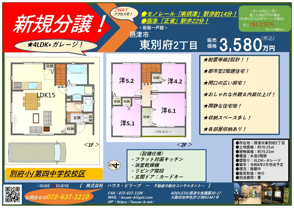 摂津市東別府2丁目 新築一戸建 4LDK 3,580万円【新規分譲開始】♪